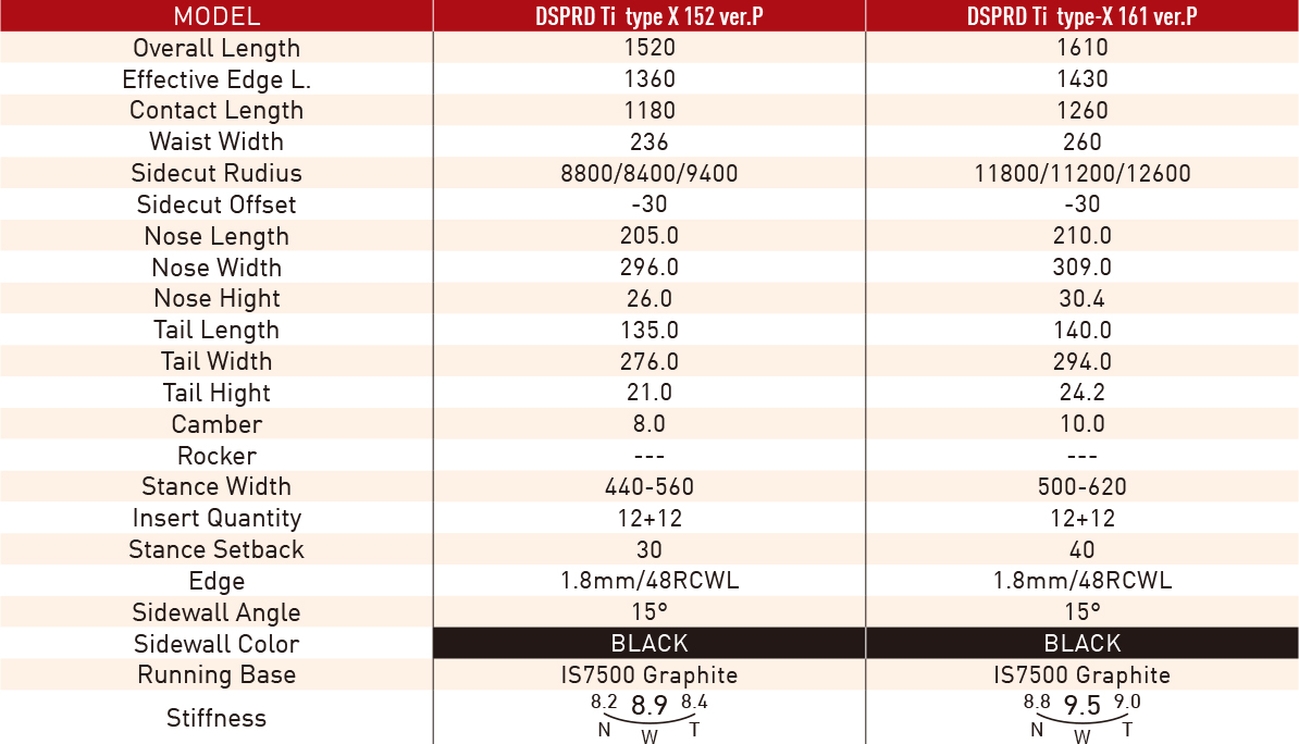 The Type-X 161 stands out with its larger sidecut radius and wider waist width. Even when the board is set on a higher edge angle than with the Type-R, it maintains smooth edge control without over-turning, minimizing drag and allowing a clean, accelerating carve line that drops naturally down the fall line. The Type-X 152 is a pure competition model redesigned specifically for women competitors. Its advanced outline shape allows complete control over turn radius — from short to middle and long turns — offering a truly versatile and precise carving experience.