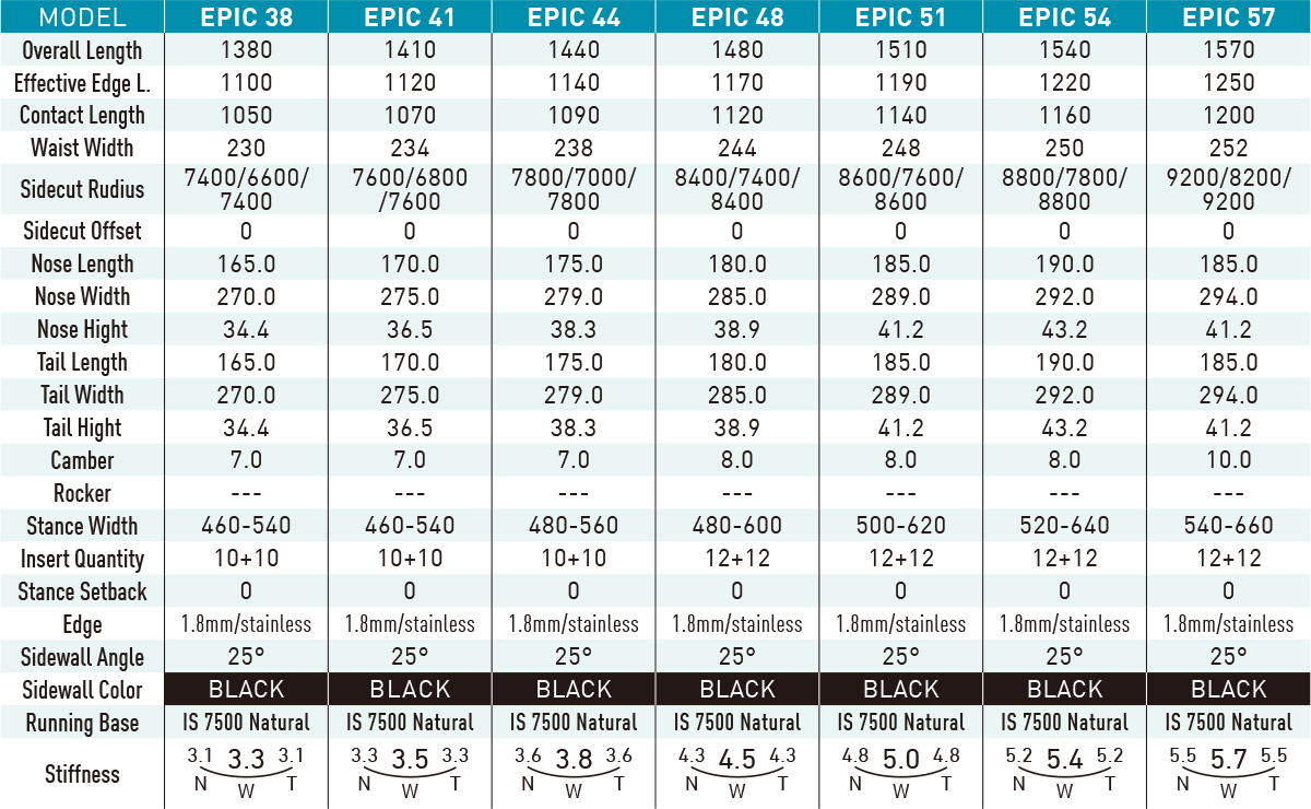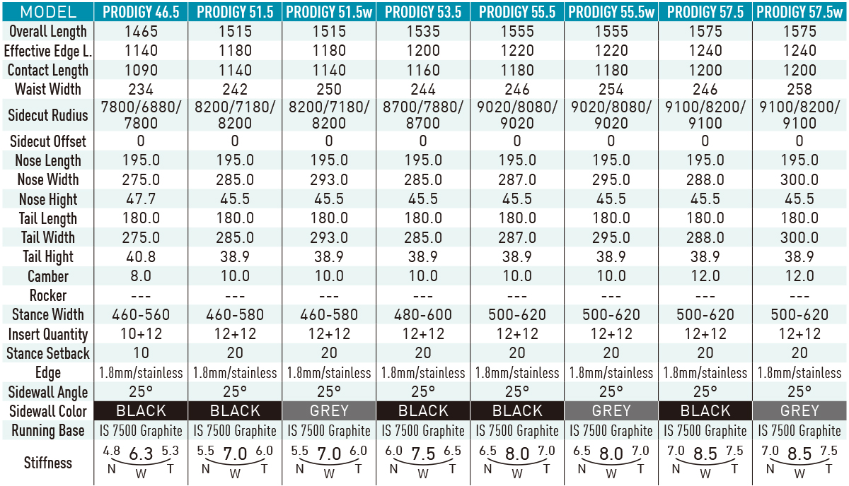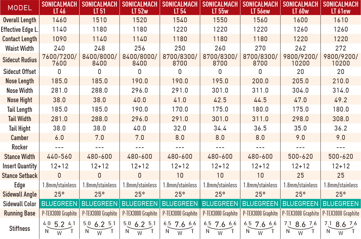 中低速域に向けた46,51,52wはフルツインシェイプとし、ラン&トリックの中でもややトリックに寄せたモデル。54, 55w, 56ewはディレクショナルツインシェイプであり、最もランとトリックを融合したスタイル。60w, 61ewはややランに寄せたモデルで、ディレクショナルシェイプとセットバックしたスタンスによりスピード感のあるスタイルを実現することができる。