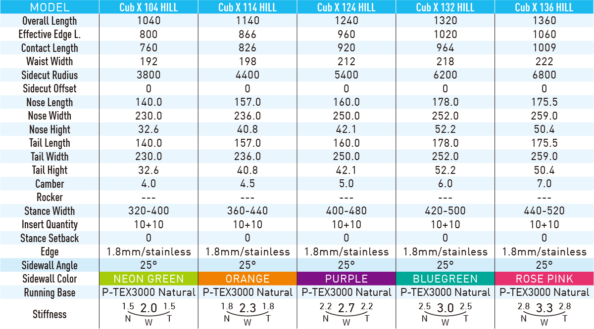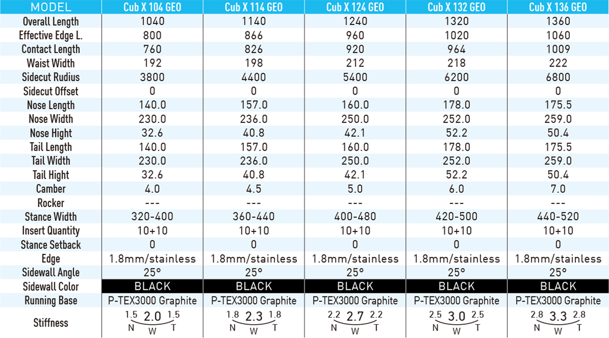 ハーフパイプ、スロープスタイル、テクニカルカーヴィングなど、さまざまな分野のキッズライダーがテストを繰り返し、オールマイティなツインモデルを完成させた。136cm以外は、インサートをオフセットすることによってブーツセンターを出しやすくした事もCUB-Xの特徴だ。滑走面にはシンタード・ベースを採用し、高い滑走性とともに耐摩耗性も高め、サマーゲレンデでの使用に耐えることもできる。