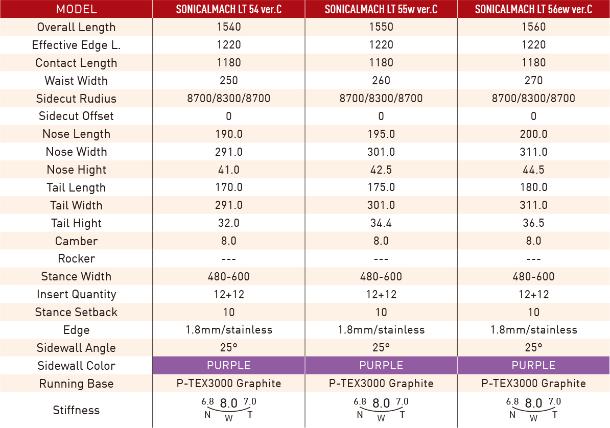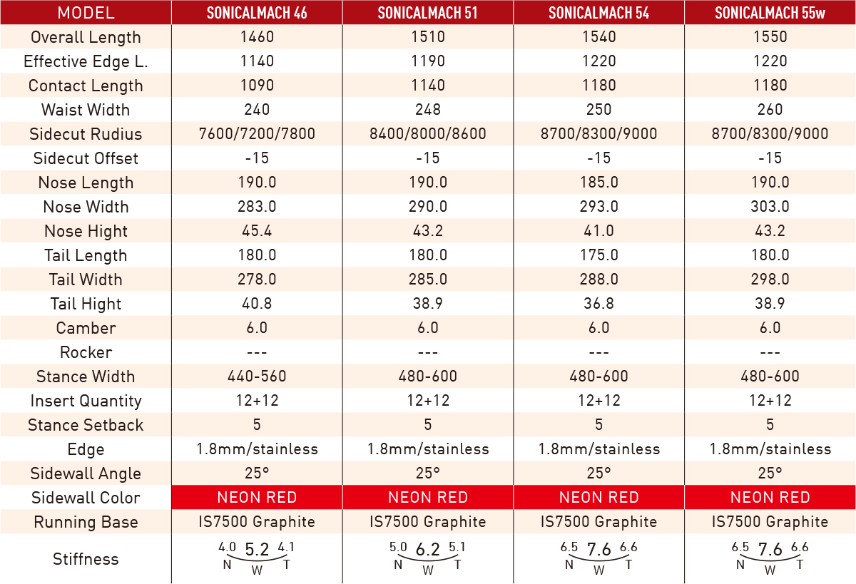 カーボン特有の速い応答性に、ポリアミド素材をトップシートに採用し高い振動吸収性を融合。複合サイドカットによる高いカーヴィング性能を持ち、限りなくツインに近いフレックスバランスとしている。「バージョンC」は、通常の54,55よりもCARVINGに寄せたフレックス設定としてさらに高速域に対応。ポリアミドトップシートとカーボンリボンの組み合わせによる、独特のハイレスポンス感が特徴のハイパフォーマンスモデルだ。ソニカルマッハシリーズのフラッグシップ、スーパーカーヴィングモデルだ。