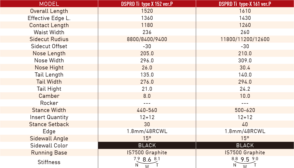 「タイプエックス 161 ver.P」の最大の特徴は、その緩めのサイドカットとさらにワイドになったウエスト幅です。例えば、Type-R使用時よりもさらにボードを立てにいった場合でも「曲がりすぎる」ことがなく、ドラッグしにくく、さらに下方向へカーヴしながら落下していく・・・と言った軌跡を表現することができる。「タイプエックス 152 ver.P」は、ウィメンズ・コンペティターのために再設計されたスペックを持つ「純競技モデル」。ショート~ミドル、ロングへとターン弧を自由自在にコントロールすることができるよう、アウトラインスペックをイチから見直しています。ポリアミドトップシートによる軽量化と、ラバーによる新しい振動吸収性能も特筆されライディングフィールです。