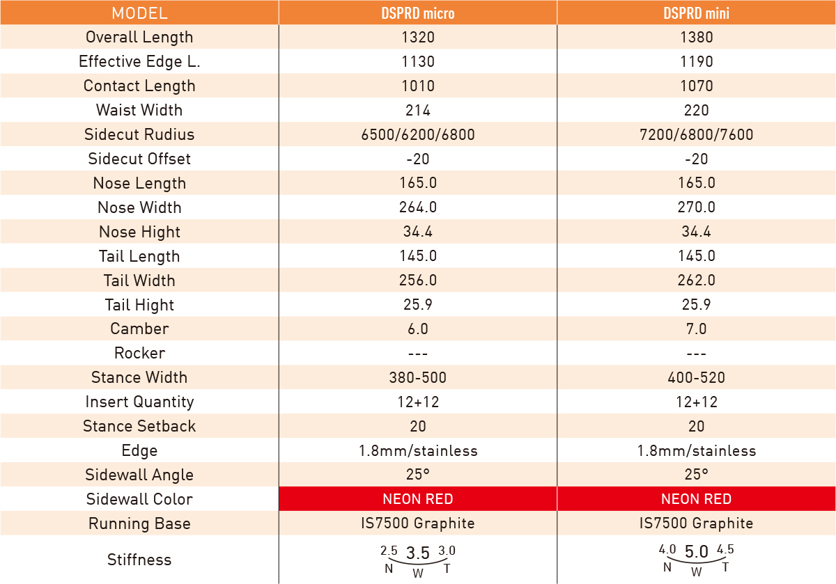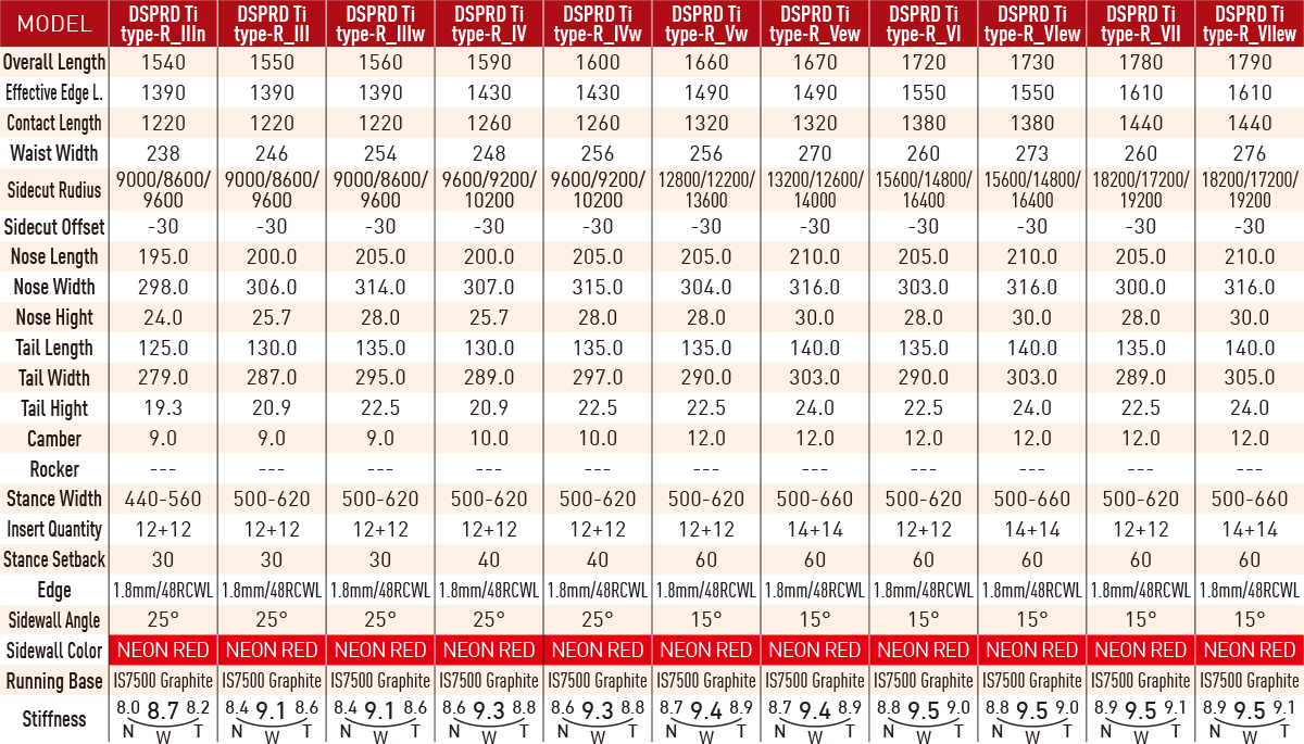 独自のハンマーヘッド理論によるテーパードシェイプとバリオキャンバー、そして複合サイドカットによる、卓越したカーヴィング性能を具現化したDSPRD・タイプアール。ノーズのアップアールにも複数のカーブを組み合わせ、ボードの角付けによる雪の捉えをスムースにコントロール。X形状にトリムした0.4mmのチタナルをトップシート下に配置し、強すぎない適度なねじれ剛性を実現しています。Type-Rはハイスピード・カーヴィングモデルとして、ハイエンド・ハンマーヘッドモデルです。