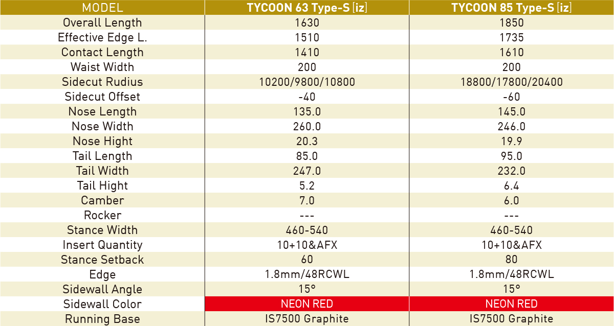 フルメタル構造のType-Sに、東洋紡の超高強力ポリエチレン繊維「イザナス®」をコア下に配置することで、ボードがたわんだあとのゆっくりとした返りを実現。メタルの切れ感と、グラス+超高強力ポリエチレン繊維「イザナス®」の粘りを融合した、今までに無いフィーリングを具現化することに成功しました。今期、185についてはイザナスのボリュームと不等厚を両面から見直し、しなやかさとともにスムースな撓 みの返りをさらにアップデート。さまざまなプレートとのマッチングも徹 底テストし、ALLFLEXだけではなくVISTなどセパレートタイプのプレートでもパフォーマンスを発揮します。プレートとのセット価格も設定しました。